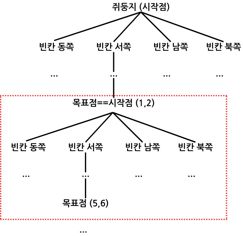 - 첫 시작점은 둥지이며, 목표점에 도달할 시마다, 시작점과 목표점을 갱신하여 다음 탐색 진행